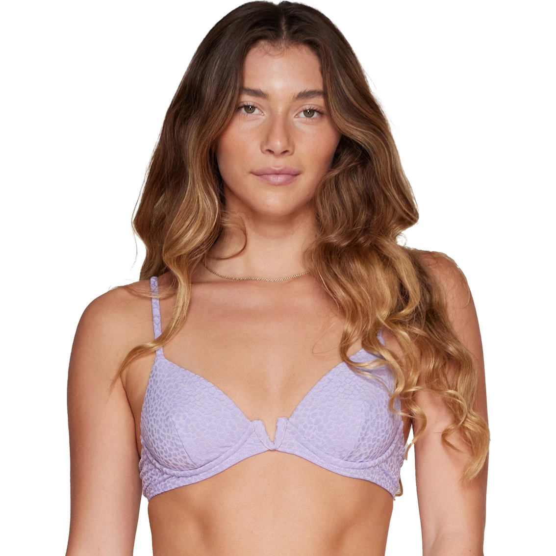 Stand out at the beach or pool in this V-front underwire bikini swim top from Damsel. It is designed with adjustable over-the-shoulder straps, back hook closure, removable soft cups and textured hot spot fabric in a lavender color. The swim top is lined for your comfort. Whether you’re a fashionista or into a sporty vibe, Damsel Swimwear offers a variety of styles to fit your mood. Mix and match tops and bottoms with different colors and patterns for a look that’s all your own. Style: EBJ1612LVNHS.