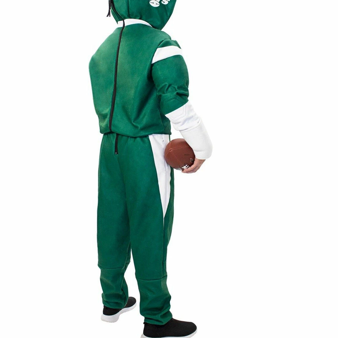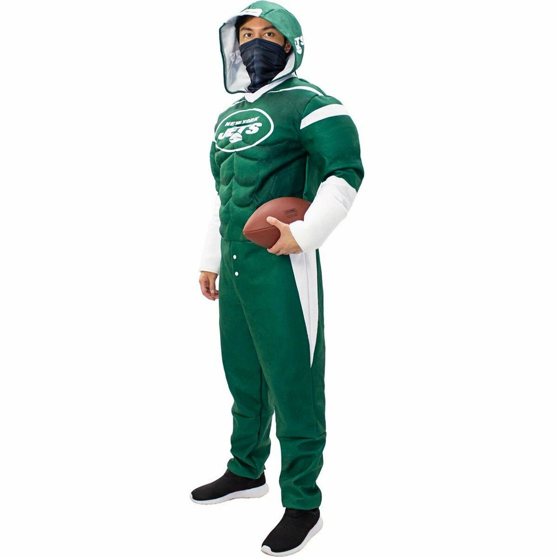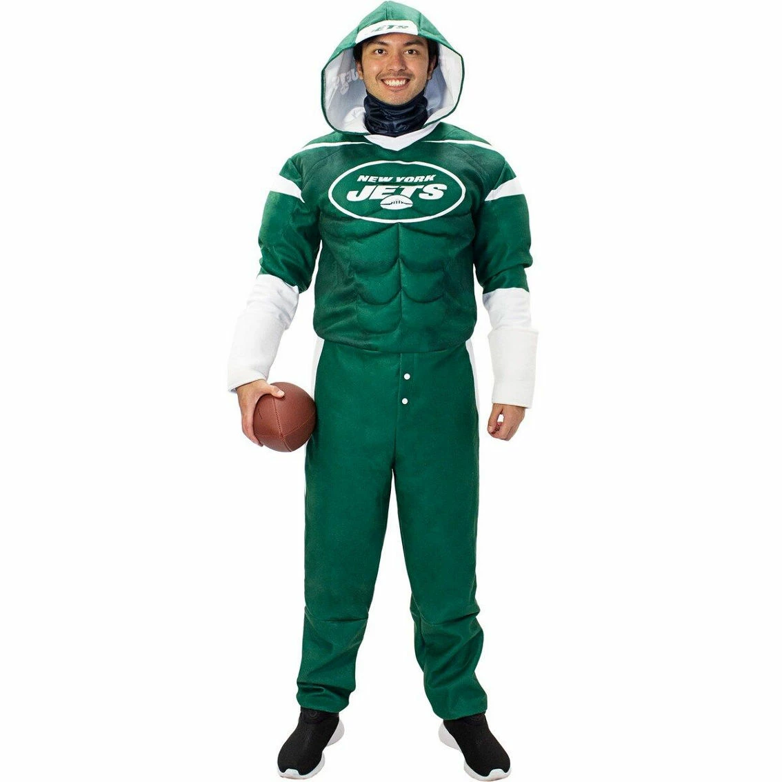 - Transform into a New York Jets player with this Game Day costume in team colors. The bodysuit features padded faux muscles, official New York Jets graphics and a zipper closure for easy dressing. Plus, polyester material creates a soft feel for hours of comfortable wearing.