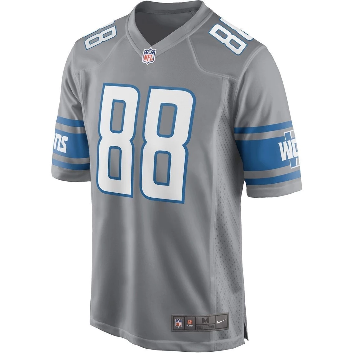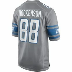 When T.J. Hockenson is on the field, opposing teams take notice, so showcase your admiration of one of the top players in the NFL with this exclusive Detroit Lions Game jersey from Nike. Complete with mesh panels for extra breathability, this jersey replicates the authentic one that T.J. Hockenson wears every Sunday, giving you the perfect piece of gear for every Detroit Lions game this season. Machine wash, tumble dry lowImportedTagless CollarOfficially licensedSide splits at hemScreen print name, numbers and team detailsMaterial: 100% Polyester TricotFit: Men’s Nike Game Jerseys have a Loose Fit. We recommend ordering one size larger than you normally wear for a looser fit or up two sizes if you plan on layering underneath the jersey.Mesh side panels for extra breathabilitySewn-on NFL Shield at collar and satin twill woven jock tag at hemBrand: NikeDesigned for movement