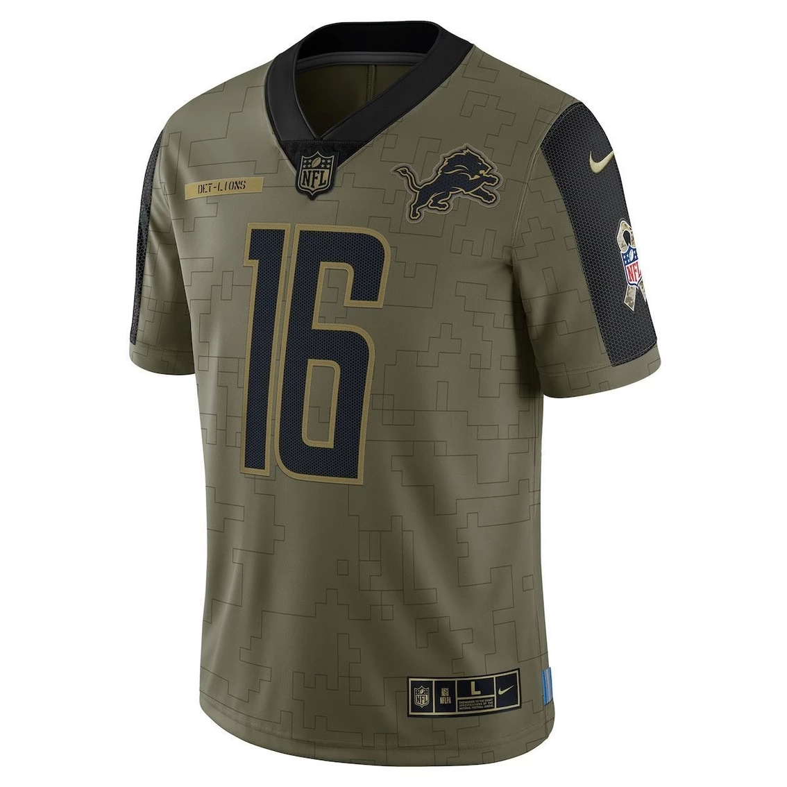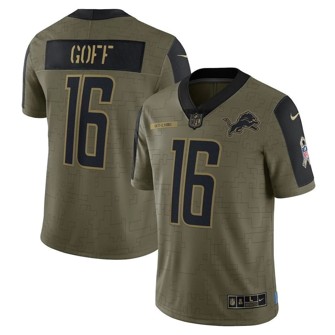- This Jared Goff Detroit Lions 2021 Salute To Service Limited Player Jersey from Nike is a spirited piece to have in your collection. It features crisp Detroit Lions graphics, a linear camo-like pattern, an American flag patch on one sleeve, and a camouflage ribbon patch on the other. The VaporKnit technology is a breathable, flexible fabric with moisture-wicking properties to keep you comfortable while cheering the Detroit Lions to victory. The NFL does not profit from the sale of Salute to Service products. Charitable contributions are awarded by the NFL Foundation to the NFL’s military nonprofit partners. For more information, please visit www.NFL.com/causes/salute.
