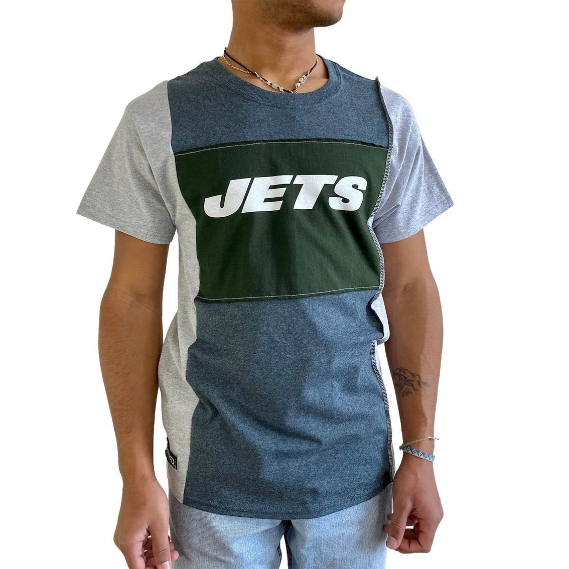 - Express your dedication to the New York Jets in distinct fashion with this Split T-shirt from Refried Apparel. Its one-of-a-kind design made out of unsold team gear features the New York Jets wordmark printed across a wide, contrast-color panel. Your favorite NFL squad will be hard to miss when you wear this upcycled crew neck tee.