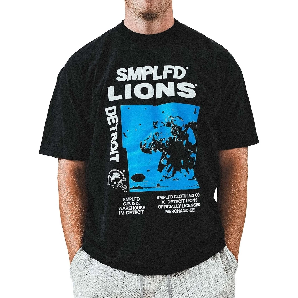 - This exclusive Detroit Lions x SMPLFD Newsprint T-Shirt is a must-have for loyal fans. Printed locally in Detroit, this collab features stylish streetwear to give you plenty of options for game day. Complete with bold Detroit Lions graphics, this top is the perfect addition to your closet.