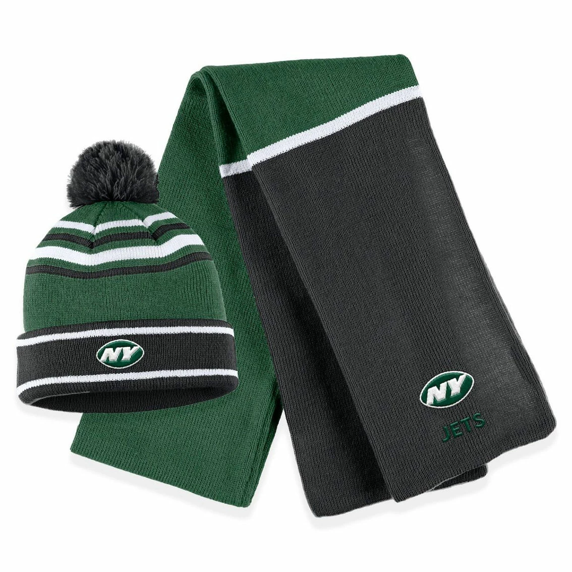 - Get warm in New York Jets style with this cuffed knit hat and scarf set from WEAR by Erin Andrews. It features embroidered team graphics and a bold two-tone design. Whether going to the stadium or enjoying a cold day outdoors, proudly rep the New York Jets with this set.